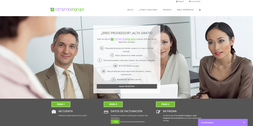 - Sección «área empresas» que permite crear landing page informativa de empresa y agrupaciones de ofertas por grupos de compra solicitados.